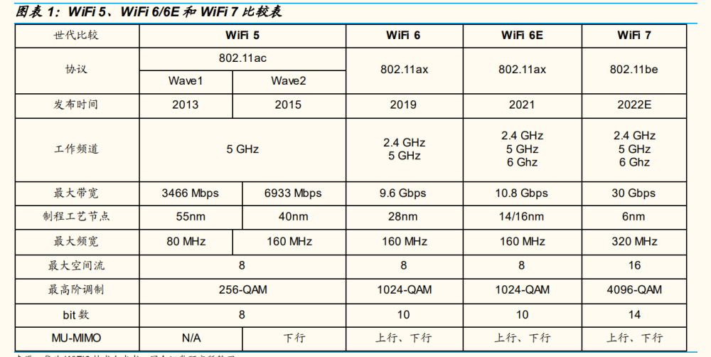 第七代 WiFi 標(biāo)準(zhǔn)規(guī)范 802.11be(WiFi7)預(yù)計(jì)將于 2022 年底發(fā)布, 新標(biāo)準(zhǔn)在第六代的基礎(chǔ)上進(jìn)一步拓展了帶寬(可高達(dá) 320 MHz),使用 更新的 4096-QAM 調(diào)制技術(shù)來(lái)提高速率,還創(chuàng)新的采用了 Multi-RU、 Multi-Link 和增強(qiáng) MU-MIMO 等新技術(shù)。WiFi 7 的到來(lái),將滿足使用者 對(duì)于高清 4K/8K 視頻,VR/AR、低延時(shí)游戲以及遠(yuǎn)程協(xié)同辦公的需求。 高通在 MWC2022 上首次推出了 WiFi 7 解決方案 FastConnect 7800, 芯片設(shè)計(jì)最大傳輸速率可達(dá) 5.8 Gbps,高通預(yù)計(jì)將于 2022 年下半年 開(kāi)始商用。