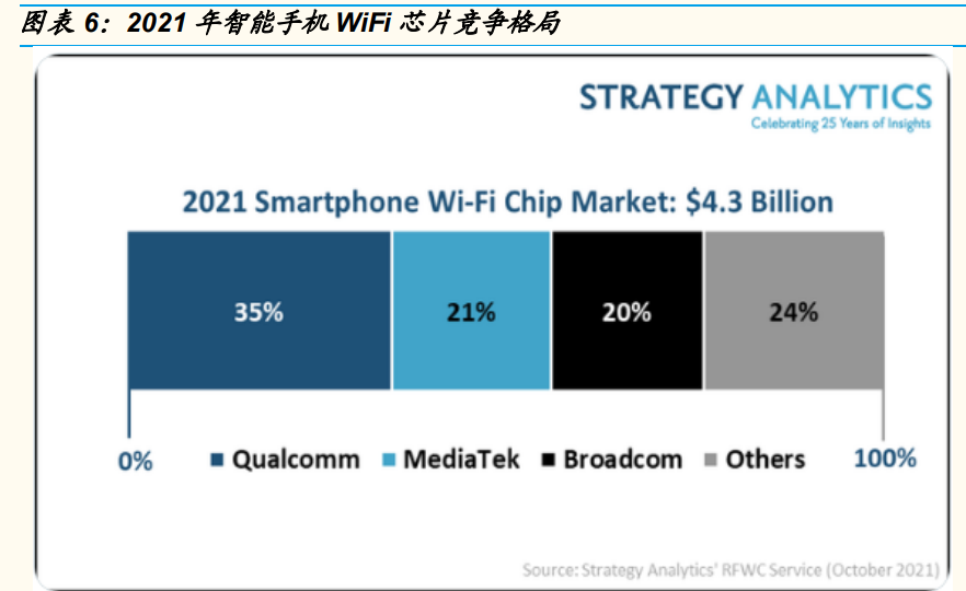 智能手機(jī) WiFi 芯片:各手機(jī)廠商當(dāng)年推出的旗艦機(jī)型通常都會(huì)采用最新的 硬件設(shè)備,WiFi 芯片也不例外。三星在 2019 年 2 月推出了第一部使用 WiFi 6 芯片的旗艦手機(jī),隨后推出的 iphone10、小米 10 以及華為 P40 等 高端手機(jī)均支持 WiFi 6。此后的兩年時(shí)間里,WiFi 6 迅速在手機(jī)市場(chǎng)中普 及,從旗艦機(jī)型到中端機(jī)乃至千元機(jī),都能見(jiàn)到 WiFi 6 的身影。根據(jù)來(lái)自 Strategy Analytics 的報(bào)告顯示,2021 年全球前三大智能手機(jī) WiFi 芯片廠 商分別是高通、博通和聯(lián)發(fā)科,合計(jì)將占據(jù)約 43 億的市場(chǎng)份額。目前的趨 勢(shì)是 WiFi 芯片會(huì)被集成在移動(dòng)處理器 SoC,我們預(yù)計(jì)未來(lái)智能手機(jī)上的 WiFi 芯片將會(huì)進(jìn)一步集成化,尤其不排除蘋果及三星設(shè)計(jì)自己需要的 WiFi 芯片,這對(duì)獨(dú)立 WiFi 芯片設(shè)計(jì)大廠博通相對(duì)不利。