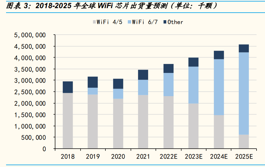 我們預(yù)測(cè)從 2018 年到 2025 年,國(guó)內(nèi) WiFi 芯片出貨量將從 4.3 億顆增加 到 10.3 億顆,年平均復(fù)合增長(zhǎng)率為 13.3%。從細(xì)分市場(chǎng)來(lái)看,WiFi 6/7 的 出貨量將從 2019 年的 4,500 萬(wàn)顆成長(zhǎng)到 2025 年的 7.7 億顆,屆時(shí) WiFi 6/7 芯片的出貨量將接近國(guó)內(nèi)全部 WiFi 芯片的 80%。雖然在 2018 年到 2020 年,國(guó)內(nèi)智能手機(jī)出貨量減少導(dǎo)致國(guó)內(nèi) WiFi 芯片出貨量在全球的比 重有所下降,但是在 2021 年,新冠疫情帶來(lái)的居家教學(xué)、辦公等需求, 以及受益于國(guó)內(nèi)物聯(lián)網(wǎng)發(fā)展加速以及代工廠產(chǎn)能開(kāi)始釋放,我們認(rèn)為 WiFi 國(guó)產(chǎn)替代將提速,國(guó)內(nèi)的 WiFi 芯片市場(chǎng)份額及出貨量滲透率將從 2021 年 的約 15%逐年提升到 2025 年超過(guò) 20%。(報(bào)告來(lái)源:未來(lái)智庫(kù))