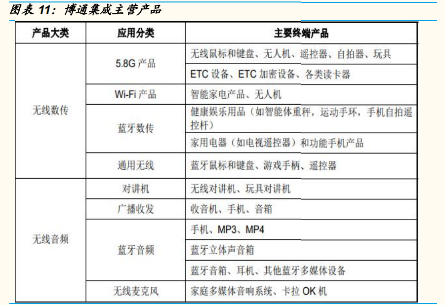 物聯(lián)網(wǎng) WiFi 芯片上富有競(jìng)爭(zhēng)力的國(guó)內(nèi)廠商還有博通集成:博通集成的 產(chǎn)品主要包括無(wú)線數(shù)傳芯片和無(wú)線音頻芯片,具體包括 5.8G 產(chǎn)品、WiFi 產(chǎn)品、藍(lán)牙數(shù)傳、通用無(wú)線、對(duì)講機(jī)、廣播收發(fā)、藍(lán)牙音頻和無(wú) 線麥克風(fēng)等。其中,來(lái)自無(wú)線數(shù)傳產(chǎn)品的營(yíng)收占 2021 年全部營(yíng)業(yè)收入 的 72.99%。2021 年,博通集成通過(guò) WiFi 聯(lián)盟的 WiFi 6 認(rèn)證,推出 了全球首款 WiFi 6 物聯(lián)網(wǎng)芯片。博通集成目前的物聯(lián)網(wǎng) WiFi 芯片以 40nm 制程為主,主要代工廠為聯(lián)電、中芯國(guó)際以及華虹宏力,主要封 測(cè)廠為長(zhǎng)電科技和通富微電。