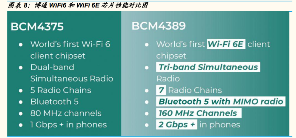 不同于高通、聯(lián)發(fā)科推行的 WiFi 芯片與處理器 SoC 芯片集成化策略, 博通采用了差異化的競(jìng)爭(zhēng)策略,采取了單芯片的策略主打高端市場(chǎng)。 高通和聯(lián)發(fā)科的 WiFi 芯片(CPU SoC 芯片)主要面向眾多手機(jī)廠商, 而博通的大客戶則是蘋果公司。但蘋果公司的最新產(chǎn)品 Iphone13 封裝 了跟前代 Iphone12 一樣的 BCM4387 WiFi 6 芯片,這是一款較為成熟 的 WiFi 6 芯片,在 BCM4375 的基礎(chǔ)上升級(jí)而來(lái),在性能上僅支持 2*2 MIMO,80Hz 信道。而三星 Galaxy S21 Ultra 是全球首款帶有 WiFi 6E 芯片的智能手機(jī),集成了博通最新的 BCM4389 WiFi 6E 芯片。